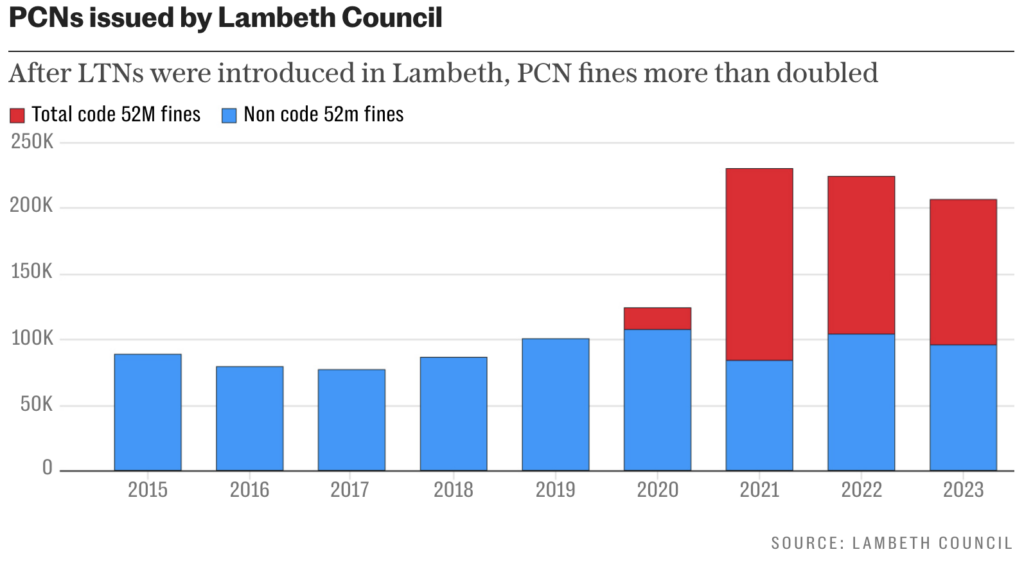 Lambeth council handed out a record 392,341 penalty charge notices (PCNs) to drivers and motorcyclists who entered roads closed to motor traffic since the Government roll-out of LTNs in 2020.