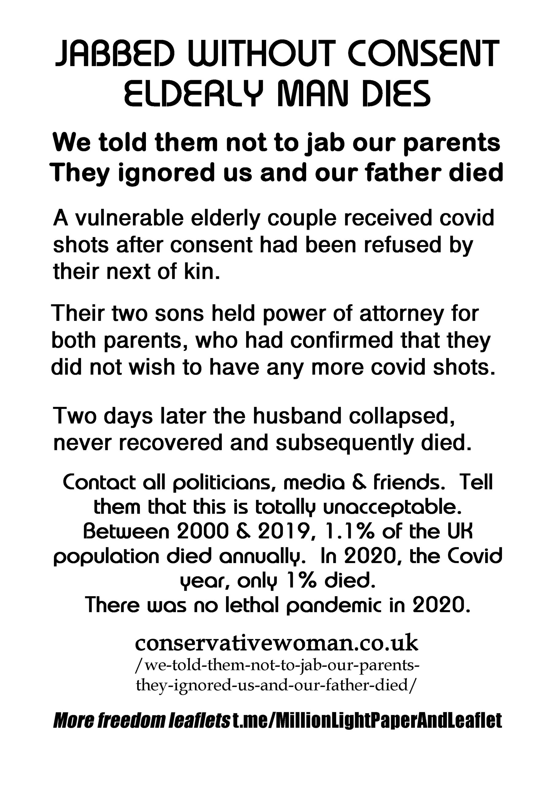 Jabbed Without Consent Elderly Man Dies – latest leaflet to print at home and deliver to neighbours or forward to politicians, media, friends online.
