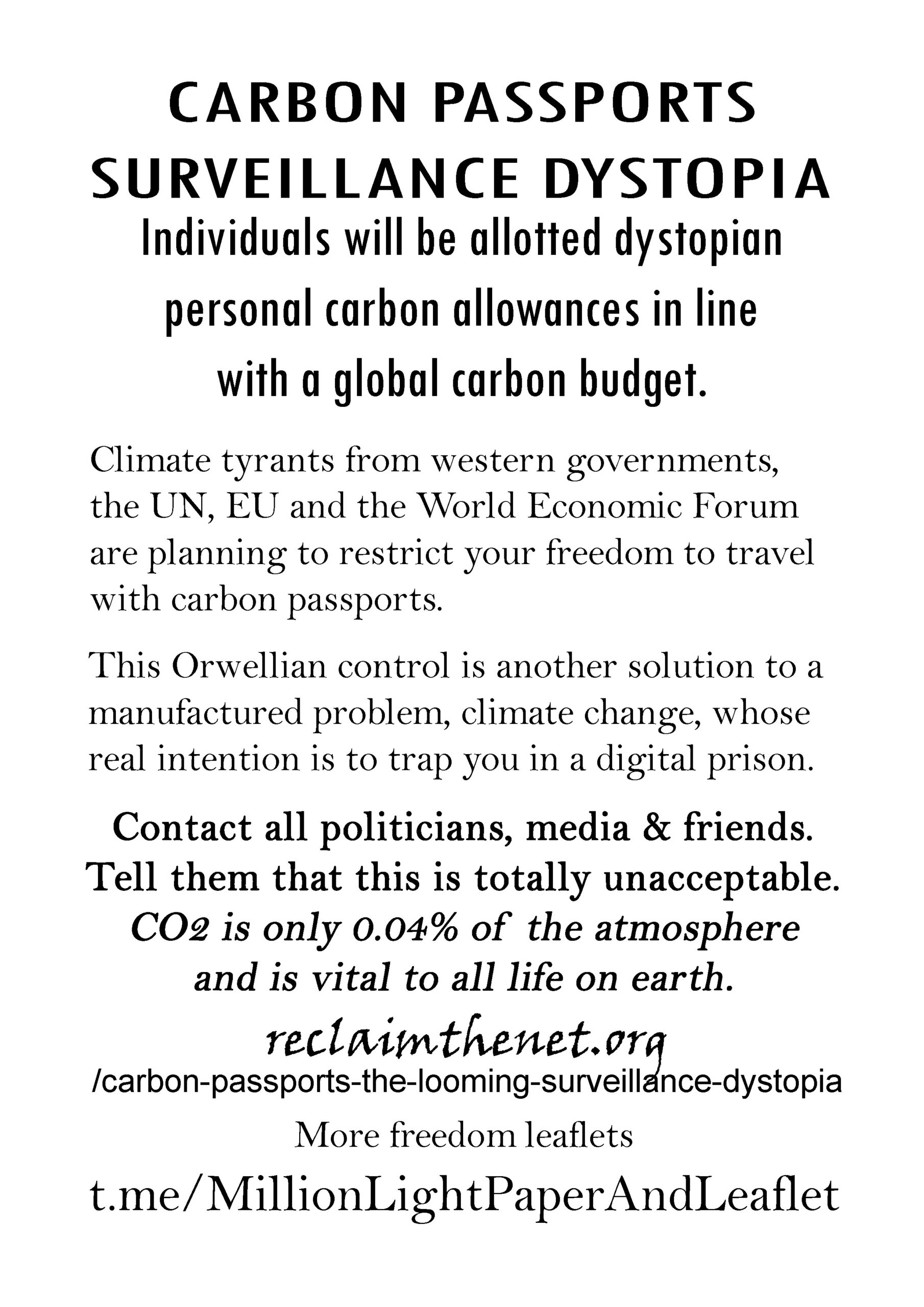 Carbon Passports Surveillance Dystopia – latest leaflet to print at home and deliver to neighbours or forward to politicians, media, friends online.