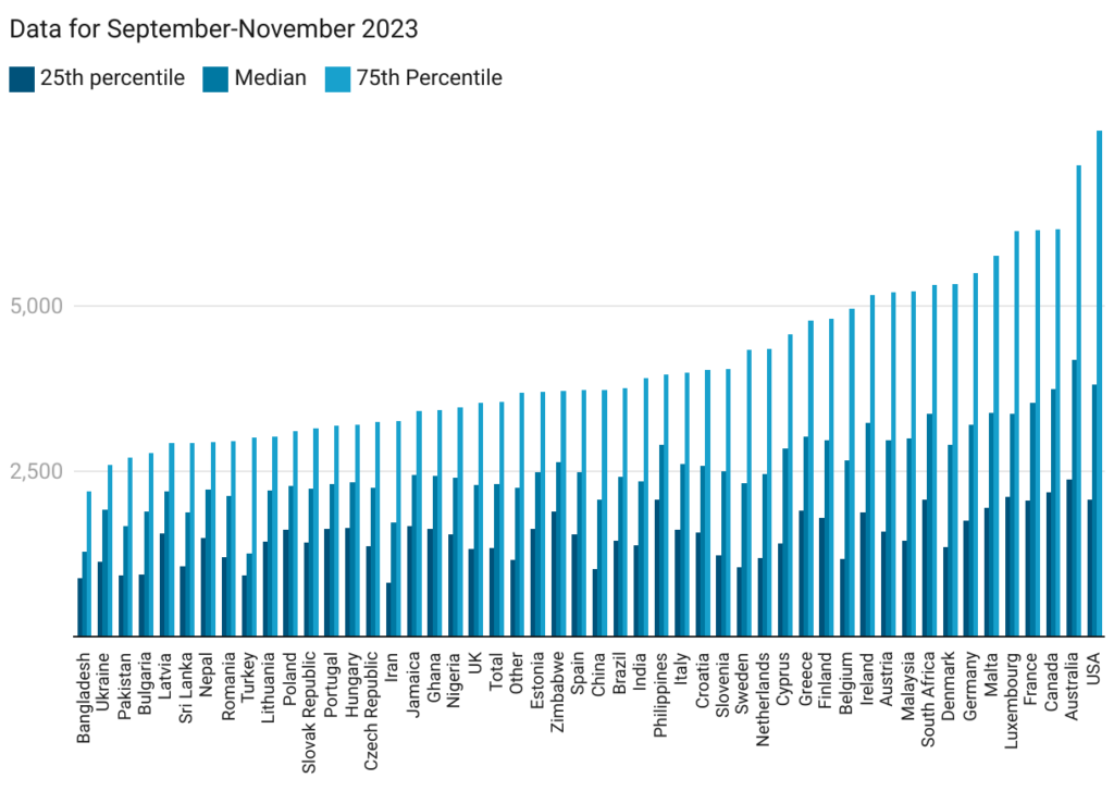 What can you see? The first thing to notice is that there’s a lot of variation across groups. The highest-earning group, Australians, make an average of about £4,000 per month. (Note that although Americans earn more at the 75th percentile, Australians earn more on average.) By contrast, the lowest-earning group, Bangladeshis, make an average of about £1,200 per month.