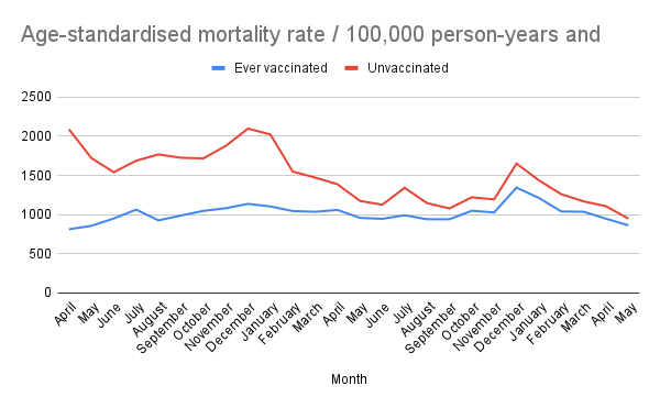 2. The healthy vaccinee effect tends to be short lived. We’re looking at ‘ever-vaccinated’, the people who were too vulnerable to be vaxxed in early 21 would, I assume, not still be hanging around in early 22.