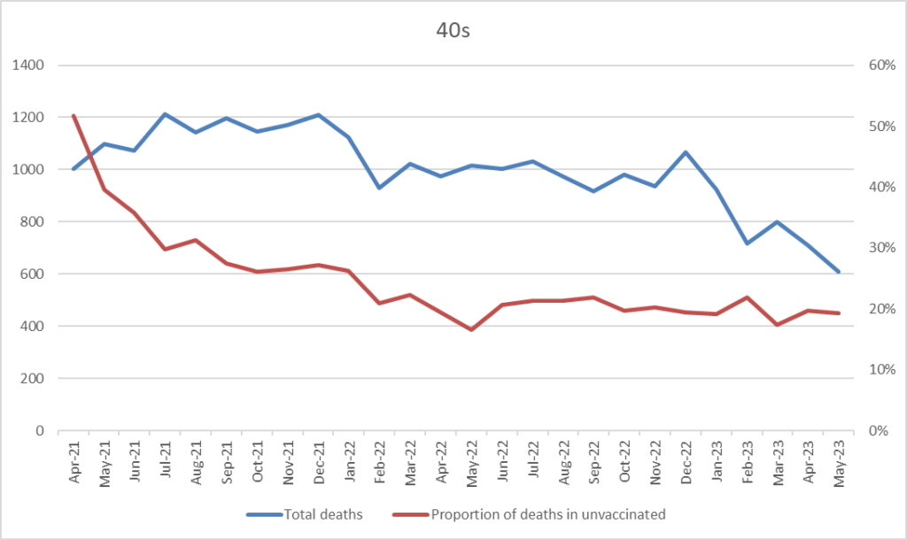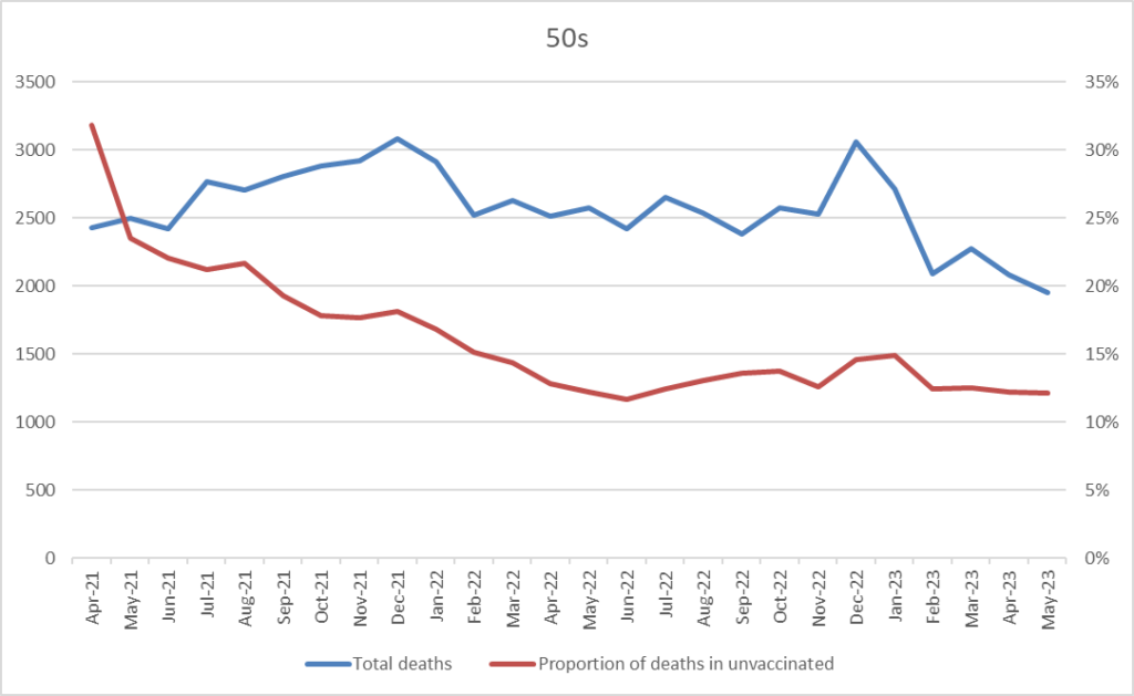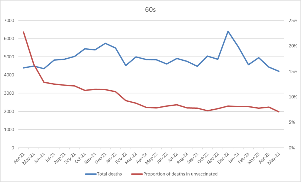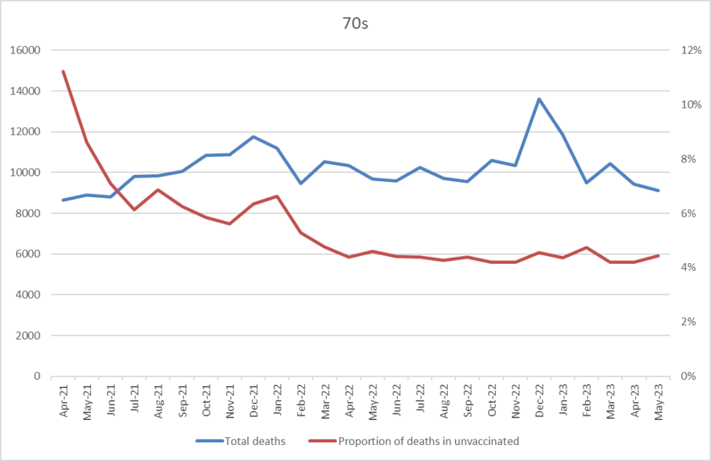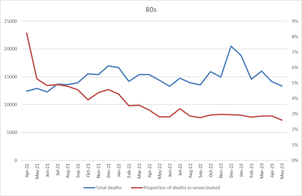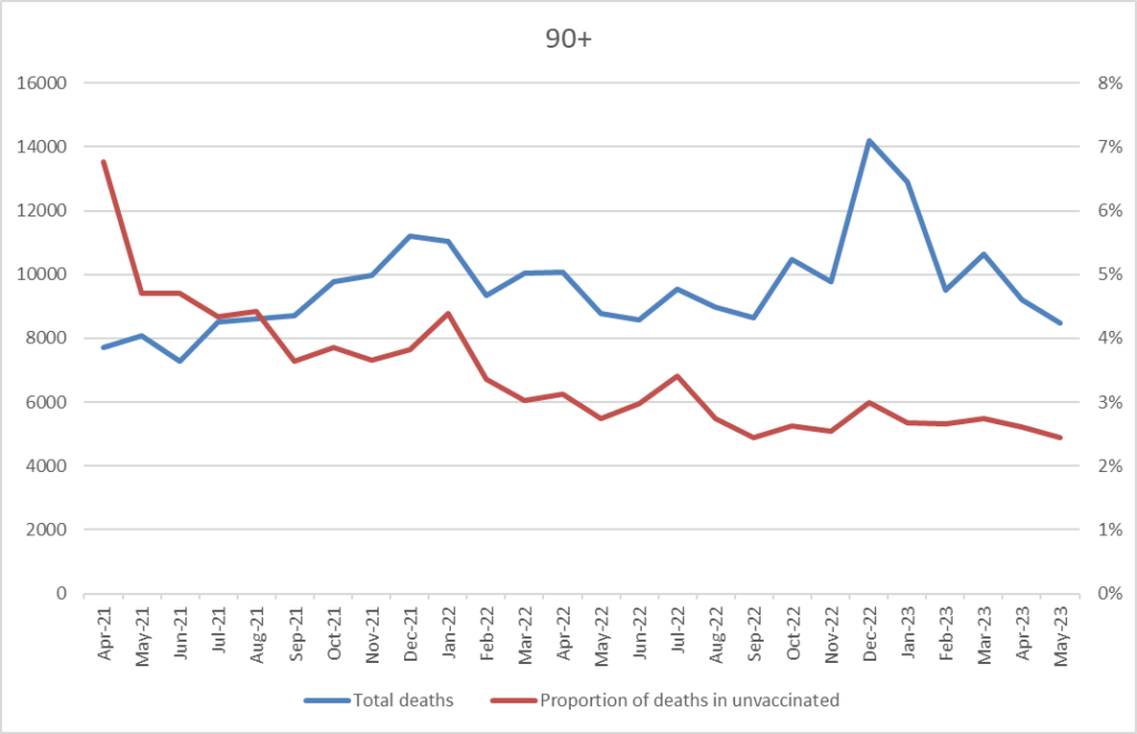 Note that the red lines during 2022 and 2023 are mostly flat, particularly for those in their 60s, 70s and 80s, even during many of the peaks in total deaths. This is particularly noticeable during winter 2022-23, where despite a large peak in deaths the red lines stay largely flat. This suggests that vaccine efficacy against death, at least from the Omicron variants, is very low, since if the virus was disproportionately killing the unvaccinated (i.e., the vaccines were protecting the vaccinated) the proportion of deaths in the unvaccinated should spike during waves. That it usually does not suggests low vaccine efficacy.