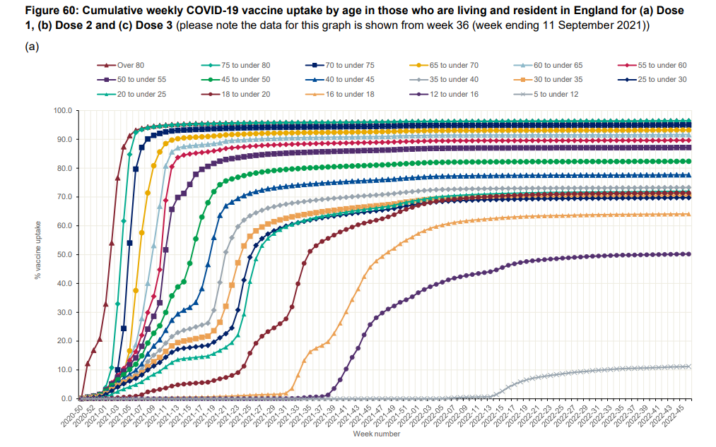 Note this is not because more people got vaccinated at that time, as the number getting their first dose in these age groups was almost zero by this point (see chart below, taken from here, data here). People getting their first dose may affect the trends seen in 2021, particularly in the first part of the year, though the over-60s were largely done with first doses by June 2021.