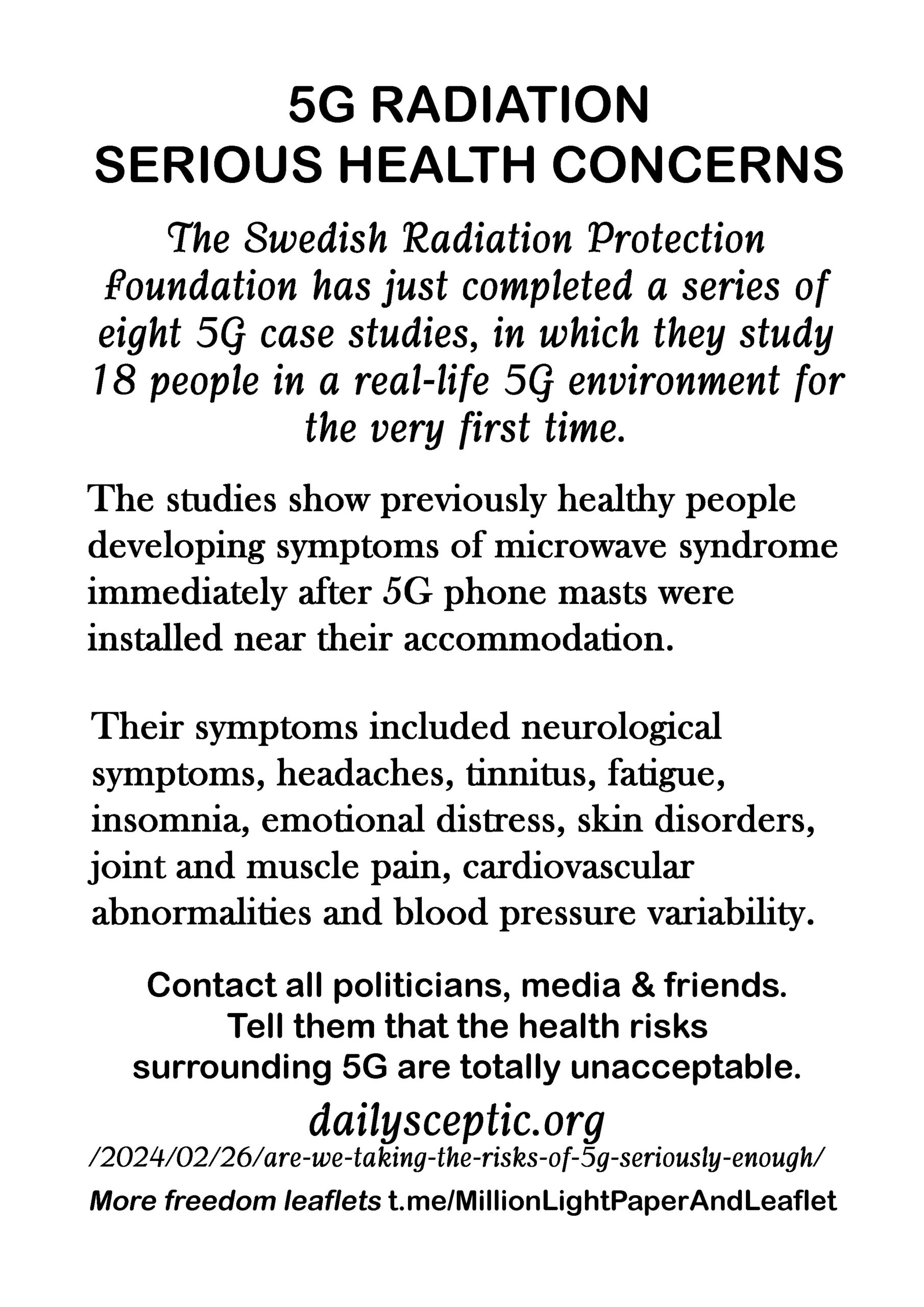 5G Radiation Serious Health Concerns – latest leaflet to print at home and deliver to neighbours or forward to politicians, media, friends online.