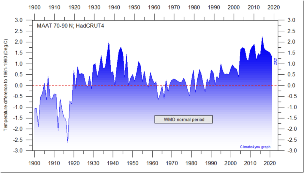The year 1979 is a convenient starting point for Arctic hysterics since it marks the end of a four decade-long cooling period as the graph below demonstrates. The recent warming seen in the Arctic has taken temperatures back to those observed in the 1930s and 1940s.