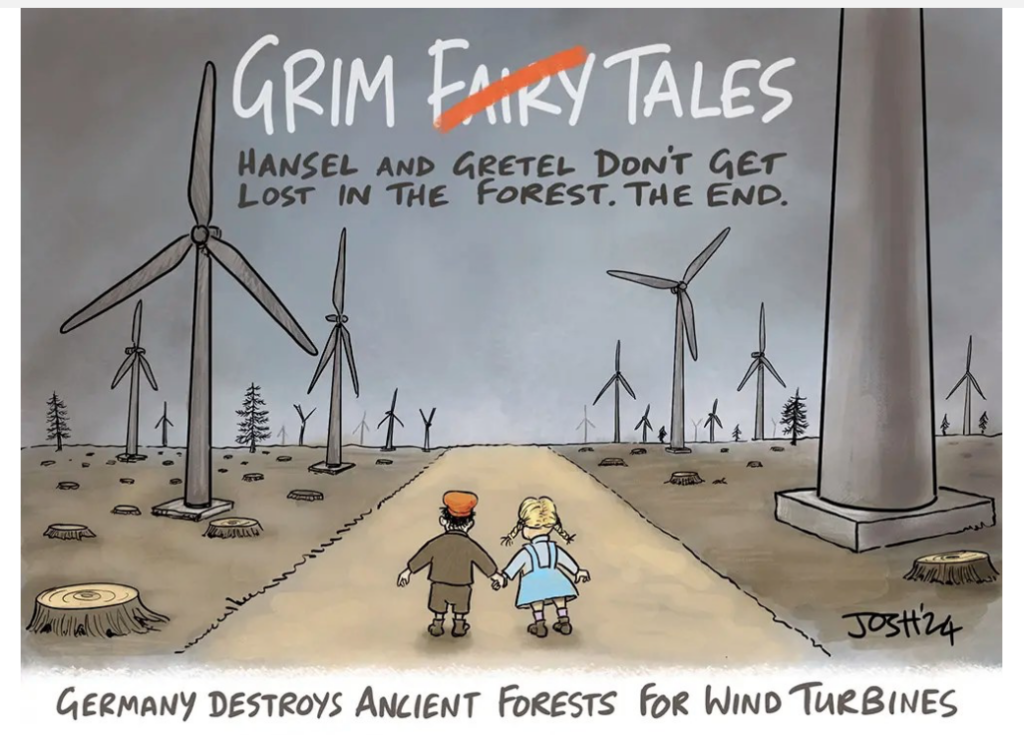 Stop Press: Our recent article on the clearing of up to 120,000 trees in the ancient German forest of Reinhardswald, setting for mythical stories by the Brothers Grimm, to make way for a wind turbine park, attracted a wide social media readership. It was reposted on the Watts Up With That? science site where the cartoonist Josh was inspired to observe…