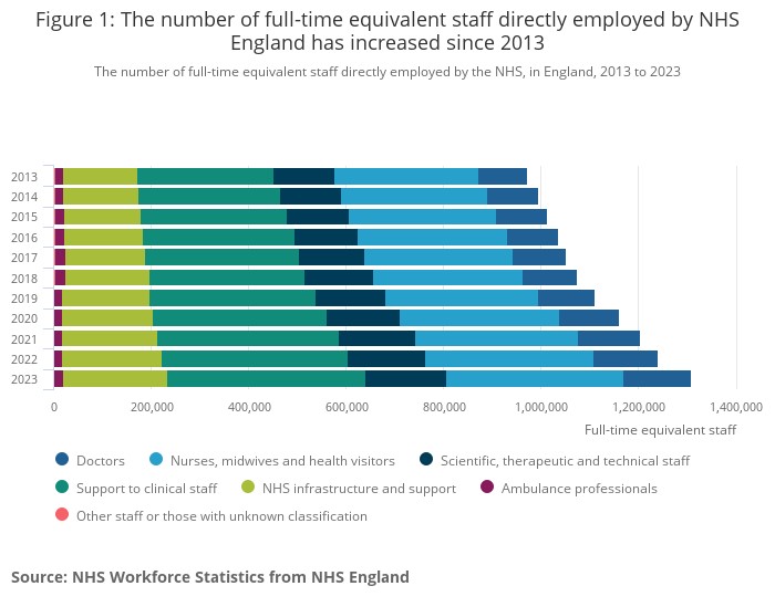 - The total number of staff increased by 338,4577 (35%) from 969,765 in 2013 to 1,308,222 in 2023.