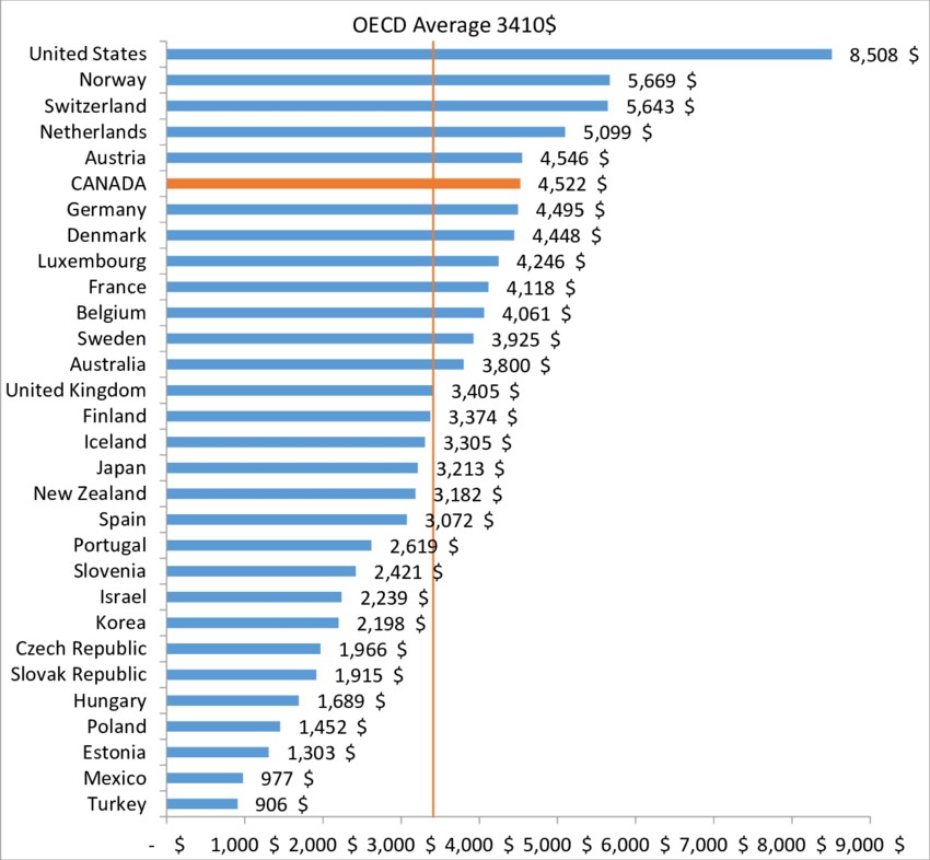 And then there’s the usual bleating that we don’t spend as much on health as other developed countries. It’s true that we spend less per capita than several European countries. But U.K. health spending per capita is on the OECD average: