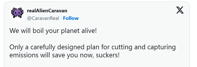 Some sceptics may argue they have done so already, with their hyperbolically exaggerated talk about ‘global boiling’ etc., but Mr. Manjoo proposed extending such lies even further by proposing the idea that evil extraterrestrials were actually behind our planet’s imminent eco-doom, by spreading ludicrous tweets like this: