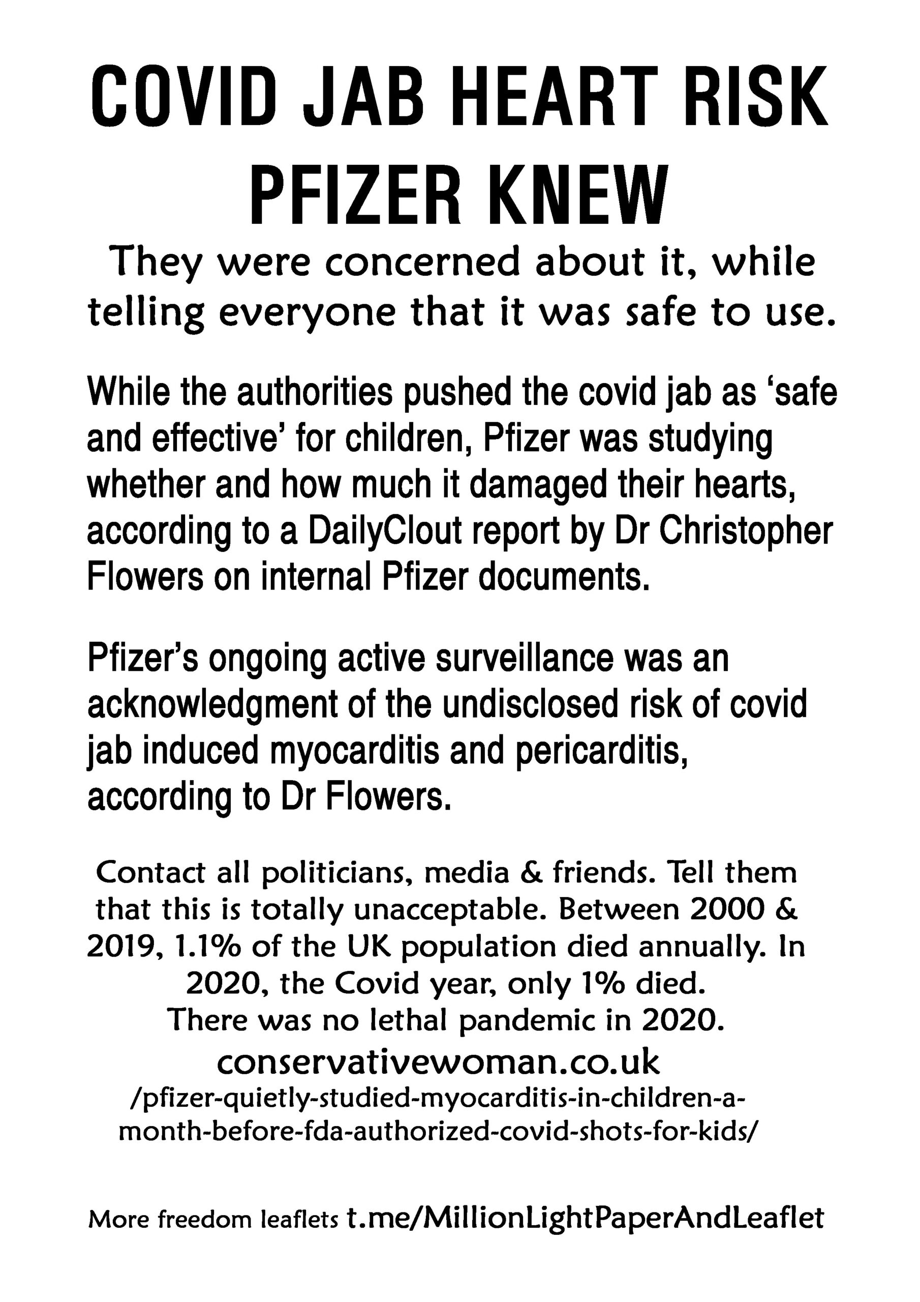 Covid Jab Heart Risk Pfizer Knew – latest leaflet to print at home and deliver to neighbours or forward to politicians, media, friends online.