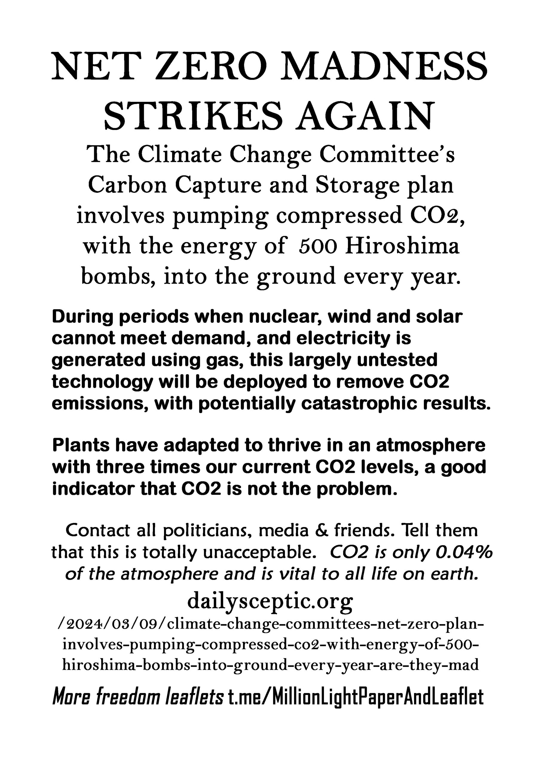 Net Zero Madness Strikes Again – latest leaflet to print at home and deliver to neighbours or forward to politicians, media, friends online.
