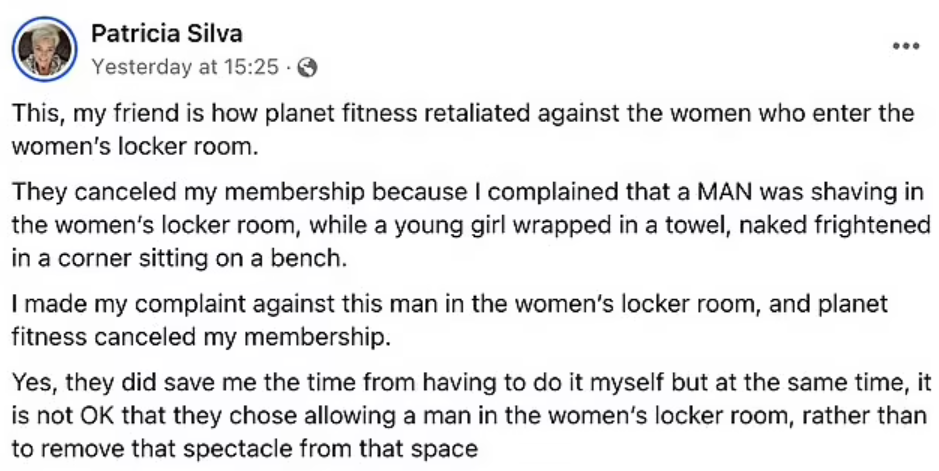 Patricia Silva was barred from the gym in Alaska after she detailed an incident online – where she said she saw a transgender woman in her locker room.