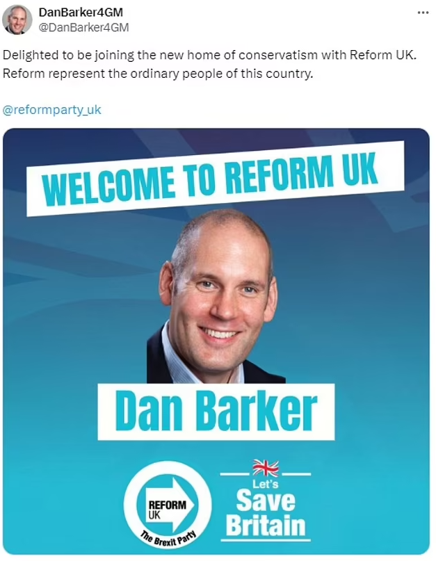 Meanwhile, the Conservative candidate for Manchester Mayor today defected to Reform. Dan Barker declared that he is switching sides, saying Reform is the “new home of conservatism”.