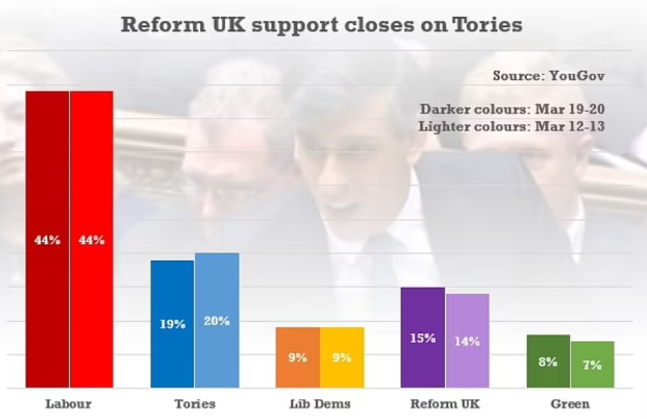 A shock poll put Reform U.K. just four points behind the Tories today on 15%, with the Conservatives down to 19%. The Mail has more.