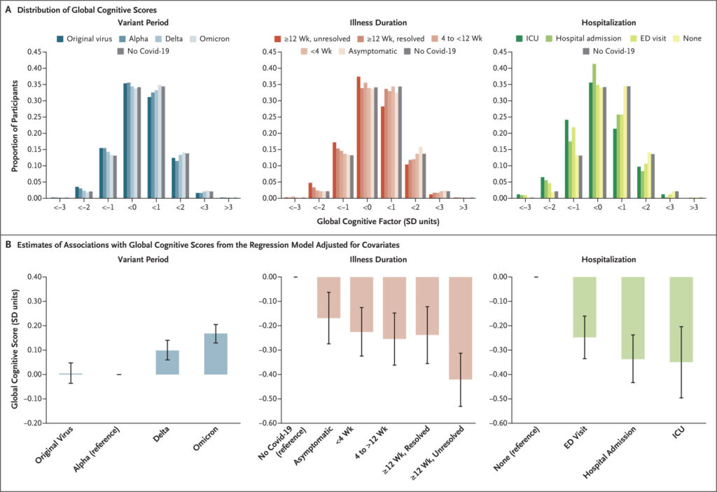 Second, the authors estimated the effects of variant, illness duration and hospitalisation on a cognitive score variable that was standardised after adjustment for demographic characteristics and pre-existing health conditions. Depending on the interrelationships among the variables, this may have resulted in larger effects of variant, illness duration and hospitalisation than would have been observed if standardisation had been done before adjustment.