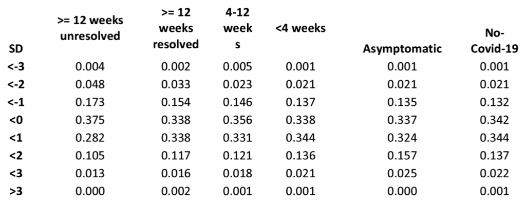 However, it’s true that one possible explanation for their findings is that Covid infection has a causal effect on cognitive ability – reducing it by 42% of a standard deviation (6 IQ points) among those with symptoms lasting more than 12 weeks. How likely is this? Before getting to an alternative explanation, I will highlight several things in the paper that caught my eye.