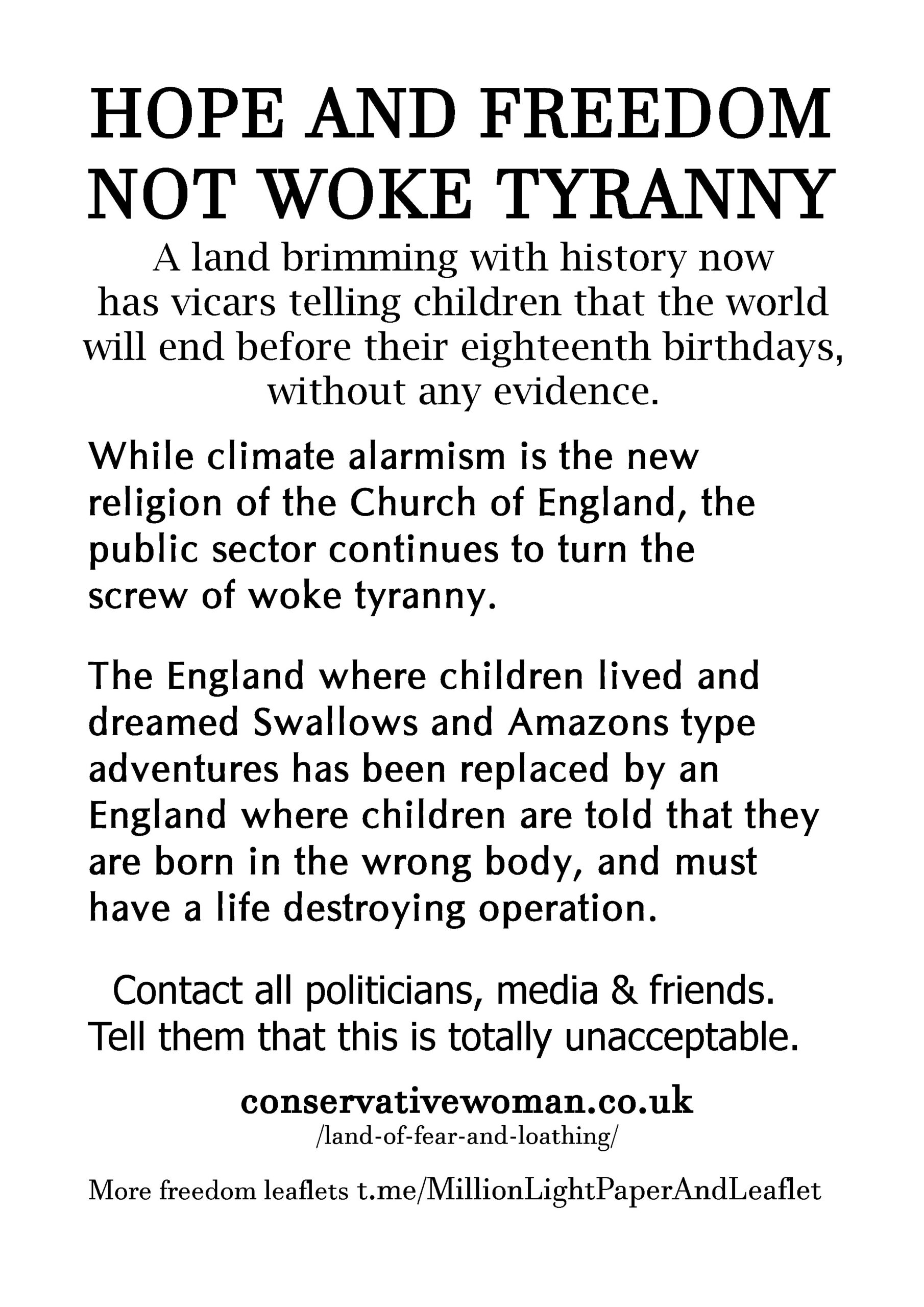 Hope And Freedom Not Woke Tyranny – latest leaflet to print at home and deliver to neighbours or forward to politicians, including your local Reform candidate, your local vicar, media and friends online.
