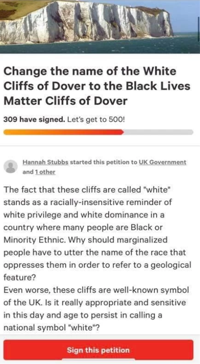 The difference between genuine and fake news stories relating to ‘anti-racist’ – or, more realistically, anti-white – ideas and events these days is slim indeed, making it hard to tell the difference between the real ones and the spoofs, as the Archbishop of Canterbury himself so recently found. In 2020, for example, following the death of George Floyd due to the existence of white people and their evil forces of law enforcement, someone called Hannah Stubbs posted a petition on online platform change.org, requesting signatures to get the White Cliffs of Dover renamed by HM Government as the Black Lives Matter Cliffs of Dover so as not to offend any of the very many non-white individuals then heading rapidly towards them illegally in small boats.