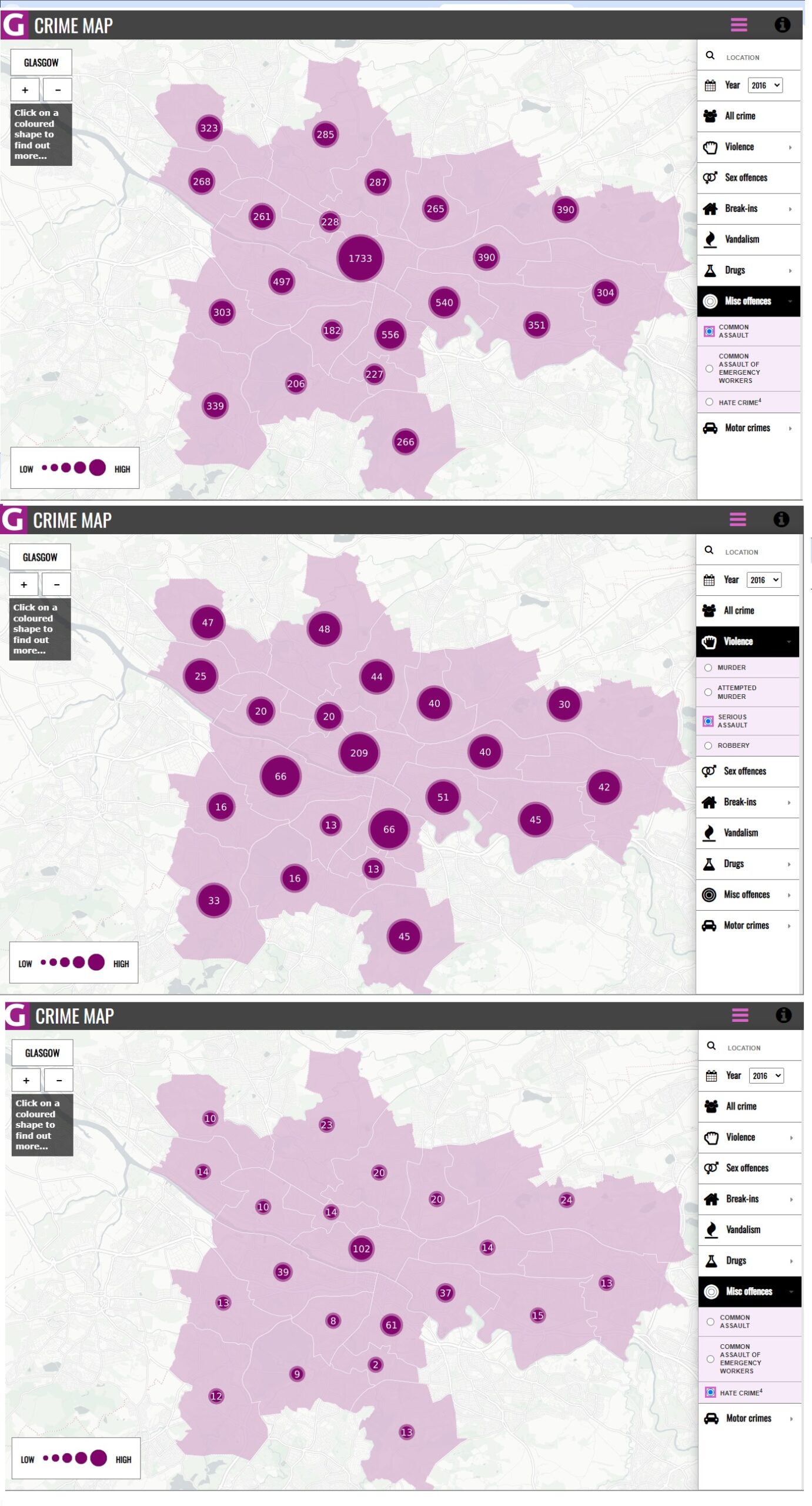 Below is a crime map of Glasgow by Sally Nichols. I have just shown 3 different views of specific crimes – Serious Assault, Common Assault (Misc. Offence), Hate Crime (Misc. Offence). Is it necessary to point out where priorities need to be, because all those writing and implementing laws are the brightest and best possessing large quantities of knowledge and wisdom?