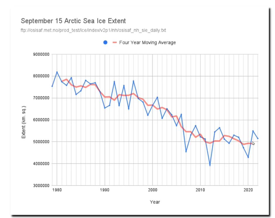 As we can see, More or Less has produced little more than a narrative-driven attempt to keep the Arctic sea ice poster scare going for as long as possible. Since the drop in the early part of the century, alarmists have been forecasting ice free summers in the Arctic in the near future. Sir David Attenborough told BBC viewers in 2022 that the Arctic could be ice free by 2035. Professor Stroeve claims to have briefed former U.S. Vice President Al Gore, a man who has never lived down reporting that the ice could all be gone by 2014. In fact what has clearly been happening is noted by Tony Heller. They bury the old data going back to the 1950s, “and pretend they don’t notice sea ice is increasing again”. Nevertheless activists are starting to learn lessons about putting short timelines on their fanciful forecasts. For her part, Stroeve suggests ice free summers in the Arctic by the next 50 years.
