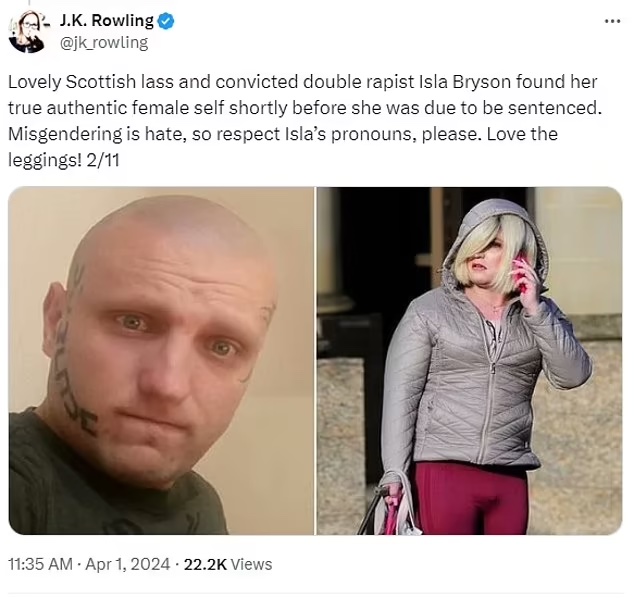 The Harry Potter author, and prominent gender critic, posted a string of tweets on X where she sarcastically urged her followers to respect “lovely Scottish lass” Isla Bryson – a convicted double rapist.