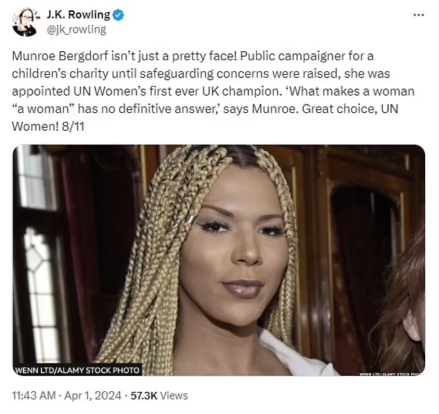 In other posts she scoffed at those who had been given high-profile roles to represent women, such as UN Women selecting Munroe Bergdorf as its first ever U.K. champion. She wrote: “What makes a woman ‘a woman’ has no definitive answer, says Munroe. Great choice, UN Women!”