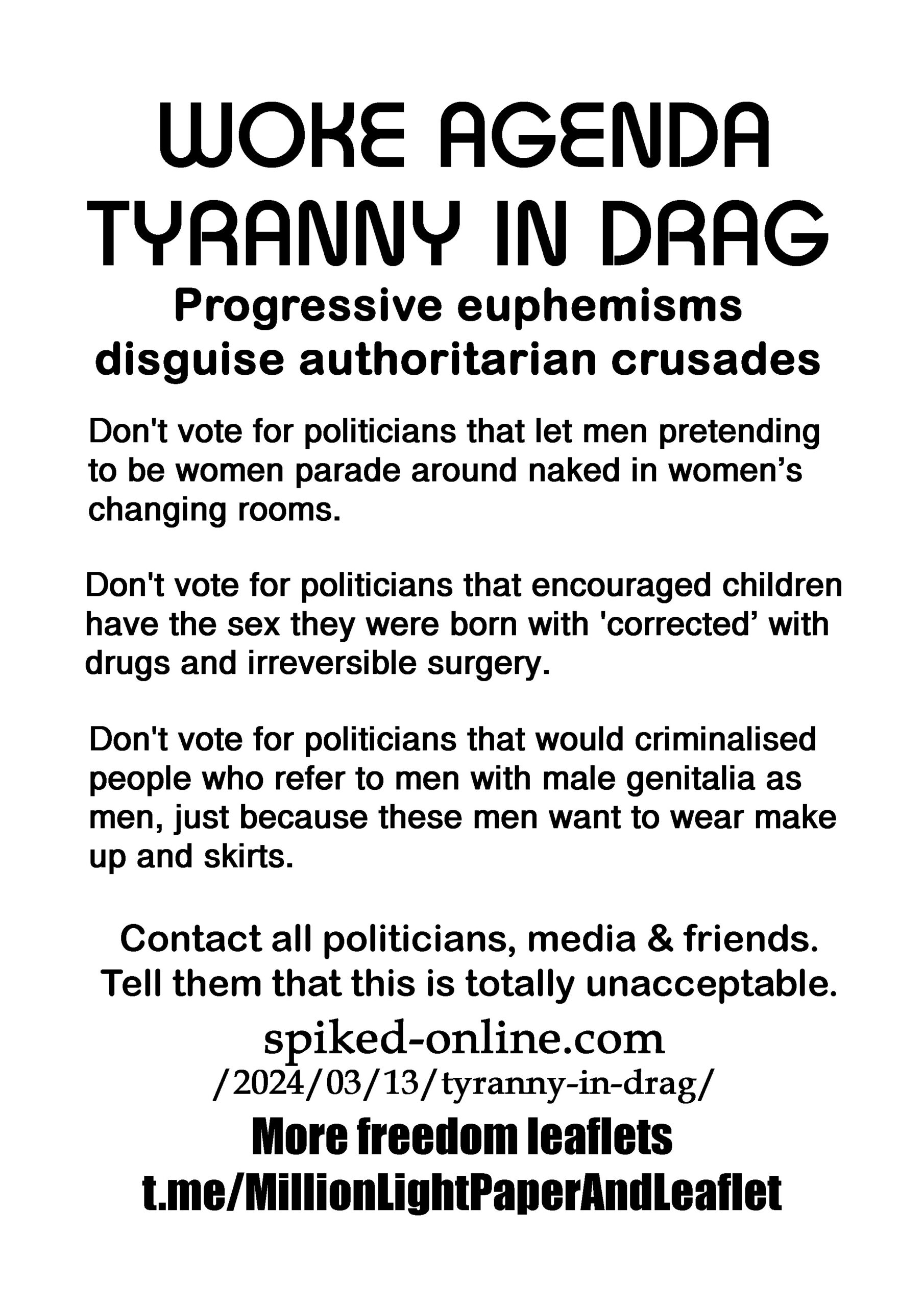 Woke Agenda Tyranny In Drag – latest leaflet to print at home and deliver to neighbours or forward to politicians, including your local Reform Party candidate, your local vicar, media and friends online.