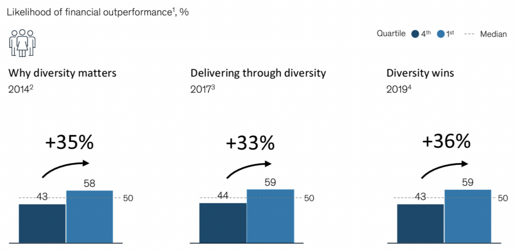The image below details some of their findings. Each chart is a comparison between firms in the bottom 25% and top 25% for executive ‘diversity’, with the outcome being the likelihood of financial outperformance (a measure of company performance). So for example, the 2014 report ‘Diversity Matters’ found that firms in the top 25% for executive ‘diversity’ were 35% more likely to achieve financial outperformance than those in the bottom 25%.