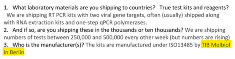 As the below excerpt from March 9th 2020 correspondence between the U.S. Department of Health and Human Services and the WHO makes clear, by early March the WHO was shipping hundreds of thousands of PCR test kits manufactured by Berlin-based TIB Molbiol. TIB Molbiol is the company of Drosten-collaborator and PCR-protocol co-author Olfert Landt.