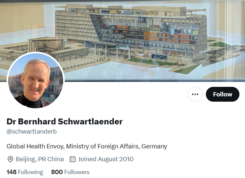 The Chef de Cabinet of WHO Director-General Tedros Adhanom Ghebreyesus in this period was the German epidemiologist – and current German Foreign Office official – Bernhard Schwartländer. Believe it or not, before becoming Tedros’s Chef de Cabinet in July 2017, just a year and a half before the official start-date of the COVID-19 outbreak in Wuhan, Schwartländer had been none other than the WHO representative in China. He presently holds the title of “Global Health Envoy” in the German Ministry of Foreign Affairs. Astonishingly, per his X profile, as seen below, and other documentary evidence (here and here), Germany’s “Global Health Envoy” is based at the German embassy in Beijing.