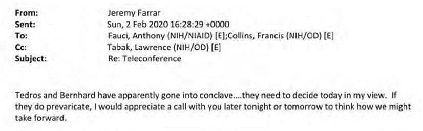 When, for instance, in late January and early February 2020, Anthony Fauci, Jeremy Farrar and other Anglosphere scientists and public health officials became concerned by signs that SARS-CoV-2 may have been genetically-engineered and wanted the WHO to lead an investigation into its origins, it was to “Tedros and Bernhard” that they appealed, as the below FOI’d e-mail makes clear.
