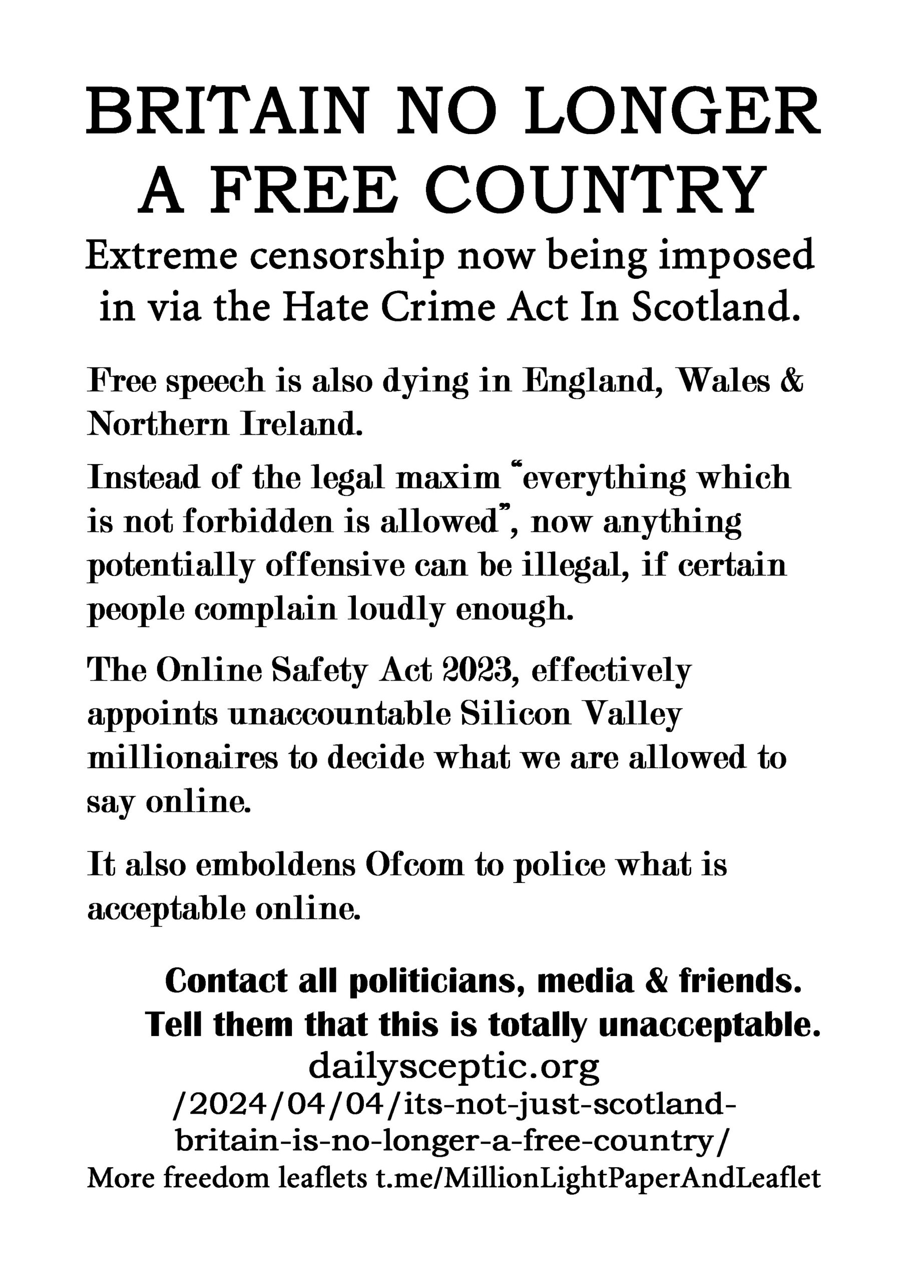 Britain No Longer A Free Country – latest leaflet to print at home and deliver to neighbours or forward to politicians, including your local Reform Party candidate, your local vicar, media and friends online.