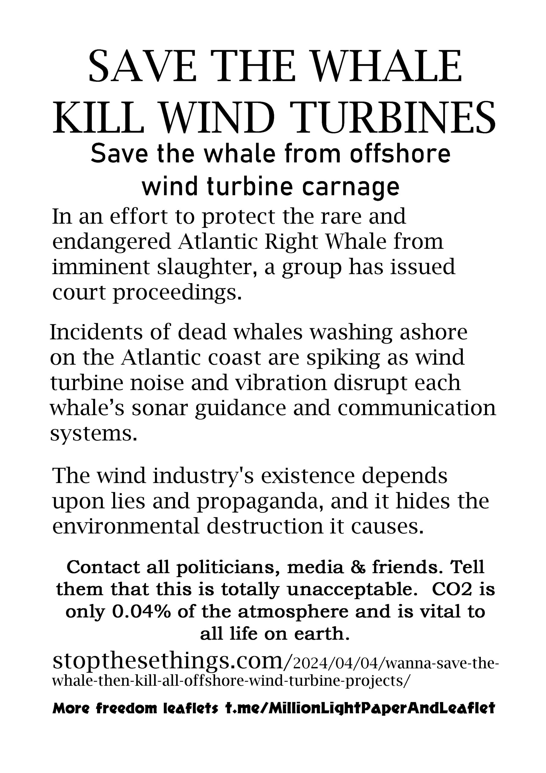 Save the Whale Kill Wind Turbines – latest leaflet to print at home and deliver to neighbours or forward to politicians, including your local Reform Party candidate, your local vicar, media and friends online.