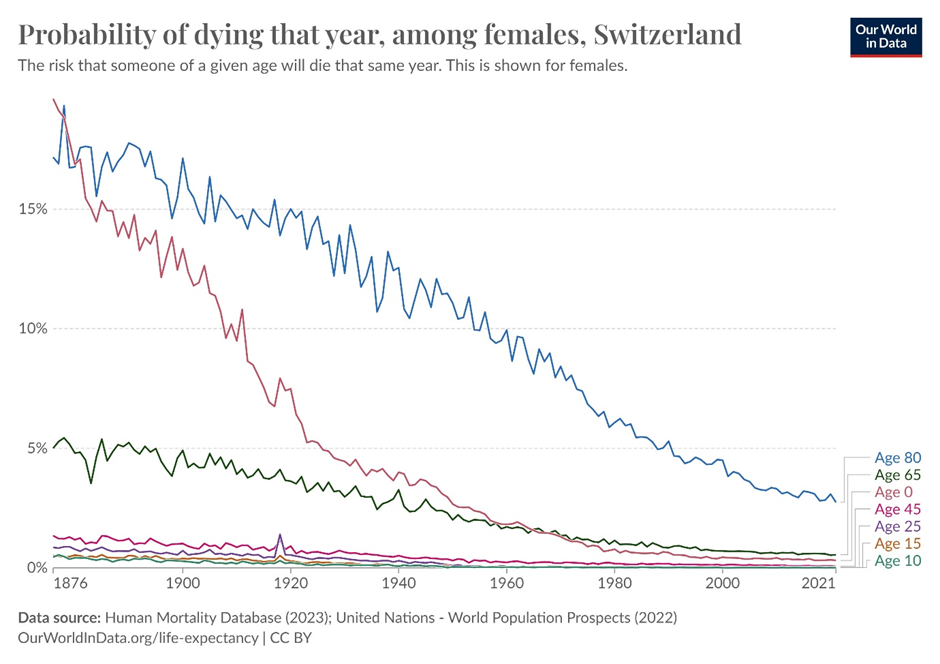 But as terrible as that might seem, these warmer summers do not appear to be harbingers of death, according to the country’s mortality statistics. Since 1990, life expectancy for Svizzers has increased from 77.4 years to 84 years. A Swiss woman reaching 80 in 1990 had a 5.3% chance of dying that year, whereas that figure is now almost halved to 2.74% – and she likely has a decade ahead of her. in 1940, a Swiss woman of the same age had a 12.6% chance of dying that year.