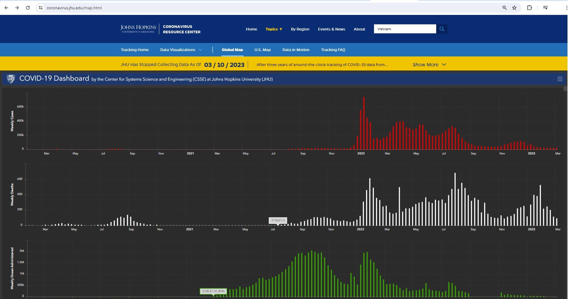 I was mistaken as Australia is a more striking example as shown below. There was a full 5 months after vaccinations began before the 2nd wave of Covid deaths and this time the deaths exceeded the first wave and persisted beyond the point where JHU stopped showing this data. In addition the oddity with Vietnam is the complete disappearance of cases and deaths. With most other countries the residual deaths during the ‘low’ seasons actually increases following the vaccinations – With Australia the ‘low’ season never happened as can been seen in the attached. Also, and as with Vietnam above, there is a disjoin between cases and deaths so that cases start being recorded nearly a month after the first deaths and this happened in each wave.