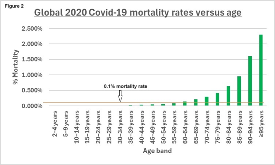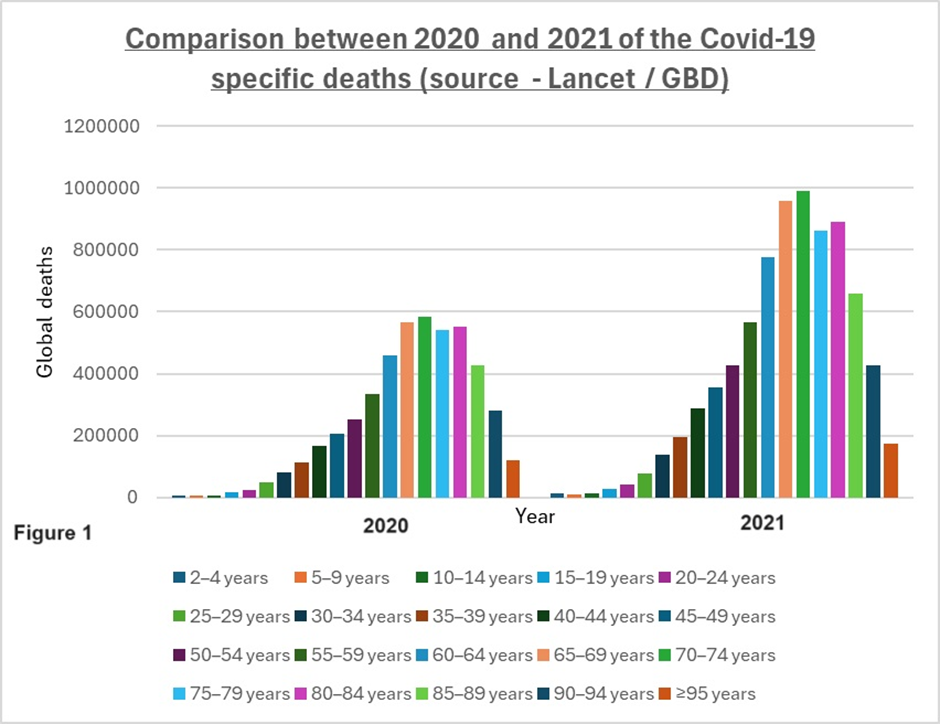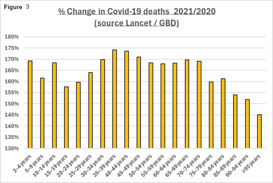 The above chart demonstrates a remarkably consistent (145% to 174%) rise in global COVID-19 deaths in all age groups peaking at 35 to 39 years. Since the risk to COVID-19 increases exponentially up to the age 80 (see Fig 1) one would expect any successful intervention to have the greatest impact in the older age groups. Higher age and risk groups were also prioritised for vaccination. In addition, there must have been a degree of natural immunity acquired after 2020 which would have had a beneficial impact in 2021. Yet mortality increased significantly across all age groups. There is also the carry-over effect of the 2020 excess deaths (mortality displacement), as you can only die once, so this should also have had a positive influence.