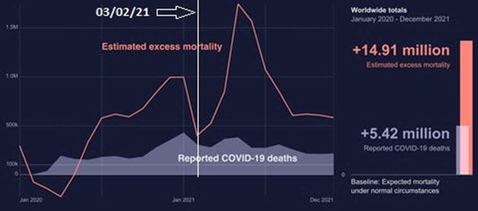 Worrying excess mortality data has also been reported by the U.K. Office for National Statistics and by the World Health Organisation. Data in the WHO report indicate an even more alarming increase in excess deaths of 131% between 2020 and 2021 and a temporal correlation with the vaccine rollout, which I have added to the chart below: