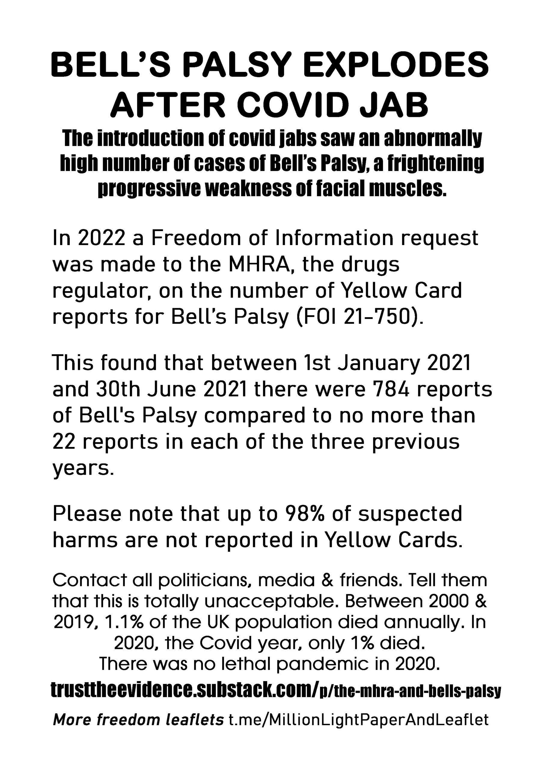 Bell’s Palsy Explodes After Covid Jab – latest leaflet to print at home and deliver to neighbours or forward to politicians, including your local Reform Party candidate, your local vicar, media and friends online.