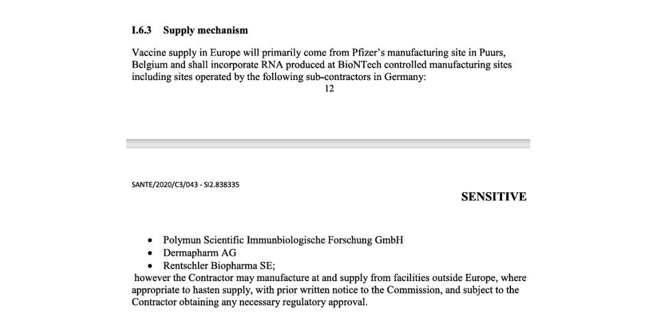 Well, the answer is buried in the EU’s ‘hidden contract’ with the BioNTech-Pfizer consortium (which I wrote about here). Thus, section I.6.3 of the contract or Advance Purchase Agreement, which was concluded in November 2020, specifies that vaccine supply “‘shall incorporate RNA produced at BioNTech controlled manufacturing sites”. It adds, however, that “the Contractor [i.e., BioNTech and Pfizer jointly] may manufacture at and supply from facilities outside Europe… to hasten supply”. See the full paragraph below, which, incidentally, is almost entirely redacted in the version of the contract published by the European Commission.