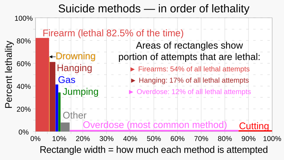 However, it isn’t only my acquaintances who have a tendency to botch their suicide attempts; most efforts are unsuccessful. I doubt any data on the efficacy of suicide attempts are particularly accurate, but the chart in Figure 1 reflects the estimates I’ve seen. 17.5% of attempts using a firearm fail. 40% of hangings fail. Heavens, even 70% of jumpers survive! One can only imagine the injuries this all results in.