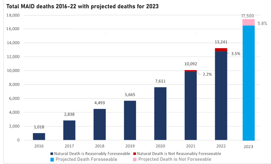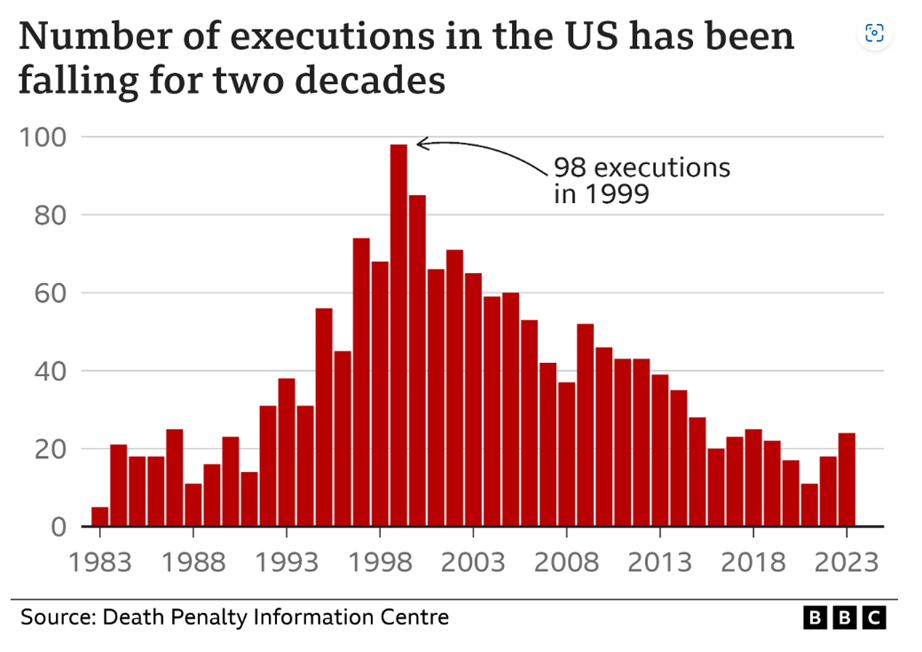 There were 24 executions in the USA in 2023. Back in 1999, enthusiasm peaked when 98 prisoners were put to death. By way of contrast, in nearby Canada something like 17,500 people will have been ‘euthanised’ in 2023. That’s almost 50 deaths per day! Quite something. Canada, with a population one eighth the size of the USA, is killing twice as many people each day as the U.S. executes in a year.