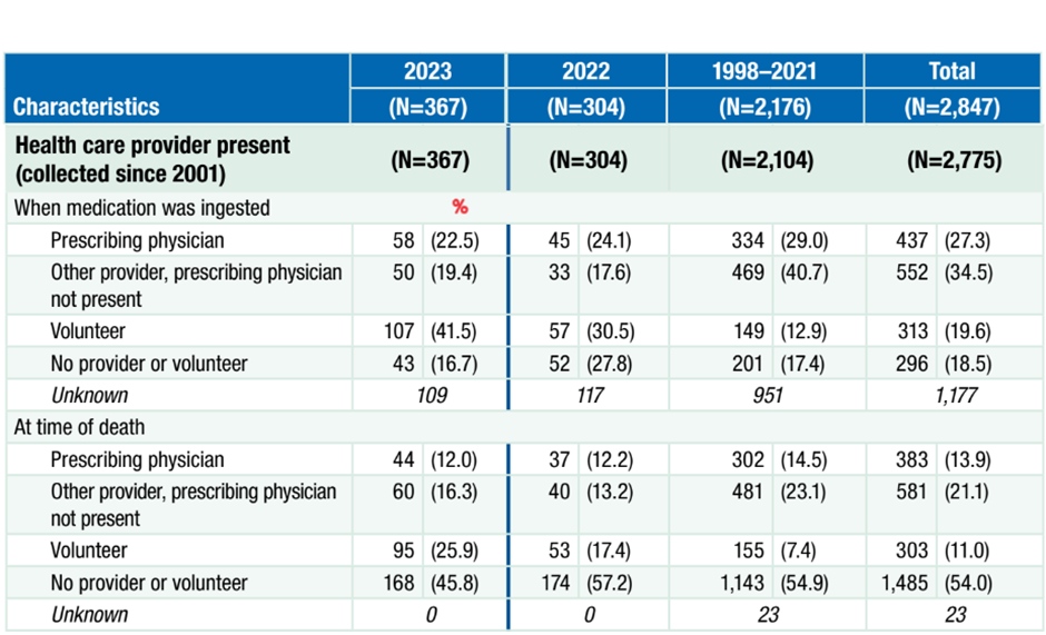 Five hundred and sixty people were prescribed the lethal drugs in 2023. Of those, 367 – just 65% – died from the cocktail. The other 193 people didn’t survive the drugs – they either didn’t take them, died of something else before ingesting the drugs or the medics lost track of them.