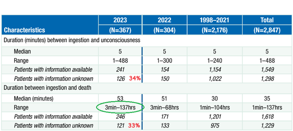Firstly, let’s look at ‘complications’. Well, the first thing that strikes you about the findings is how incomplete they are. Of the 367 who took the poison there are no data for 265 (72%) of them. Of the 102 (28%) for whom we have data, 8% had difficulty swallowing or regurgitated the poison. One patient had a seizure.