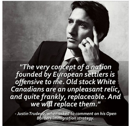 Trudeau is known for making innumerable public statements online and elsewhere, continually extolling the alleged virtues of multiculturalism and mass immigration. By doing so, could Canada’s PM quite unknowingly be leaving himself open to future Bill C-63 complaints being made against him by certain politically dissatisfied individuals who would consider his remarks to be tantamount to the encouragement of so-called ‘genocide by substitution’ against those “Old Stock White Canadians” he was once supposed to have derided in that old fake meme of his?