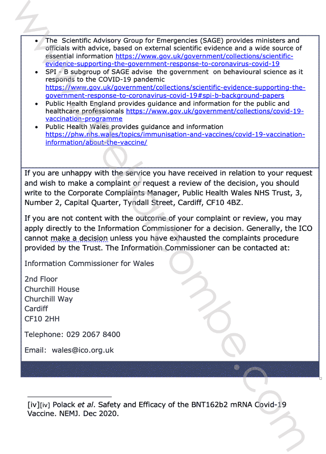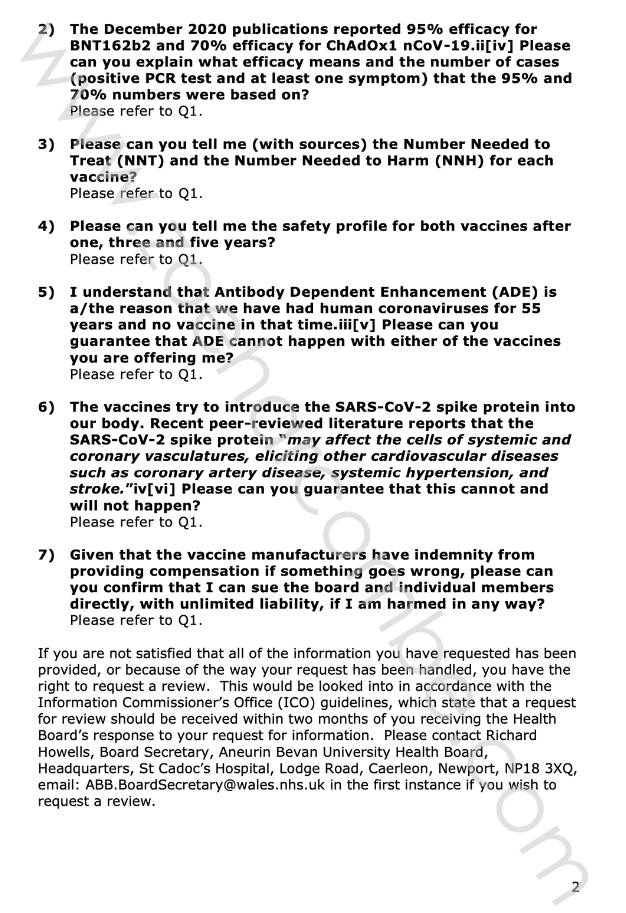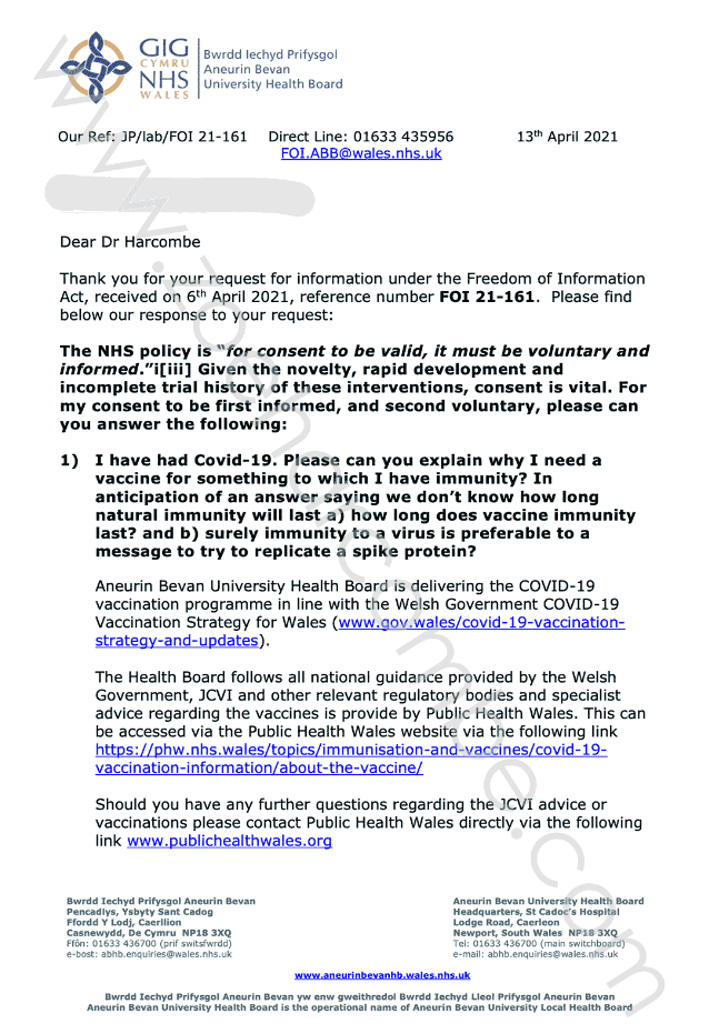 Following an invitation for a COVID-19 vaccination, I asked the following questions of my Health Board – Aneurin Bevan University Health Board. They have not answered them, but instead replied that “The Health Board follows all national guidance provided by the Welsh Government, JCVI and other relevant regulatory bodies and specialist advice regarding the vaccines is provide by Public Health Wales… Should you have any further questions regarding the JCVI advice or vaccinations please contact Public Health Wales directly.”