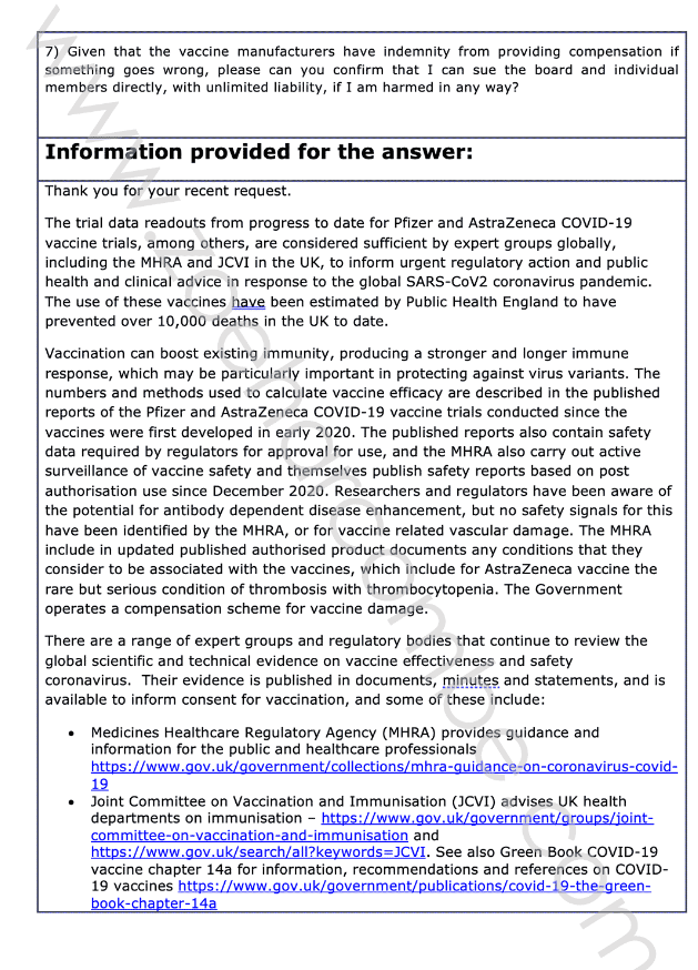 7) Given that the vaccine manufacturers have indemnity from providing compensation if something goes wrong, please can you confirm that I can sue the board and individual members directly, with unlimited liability, if I am harmed in any way?