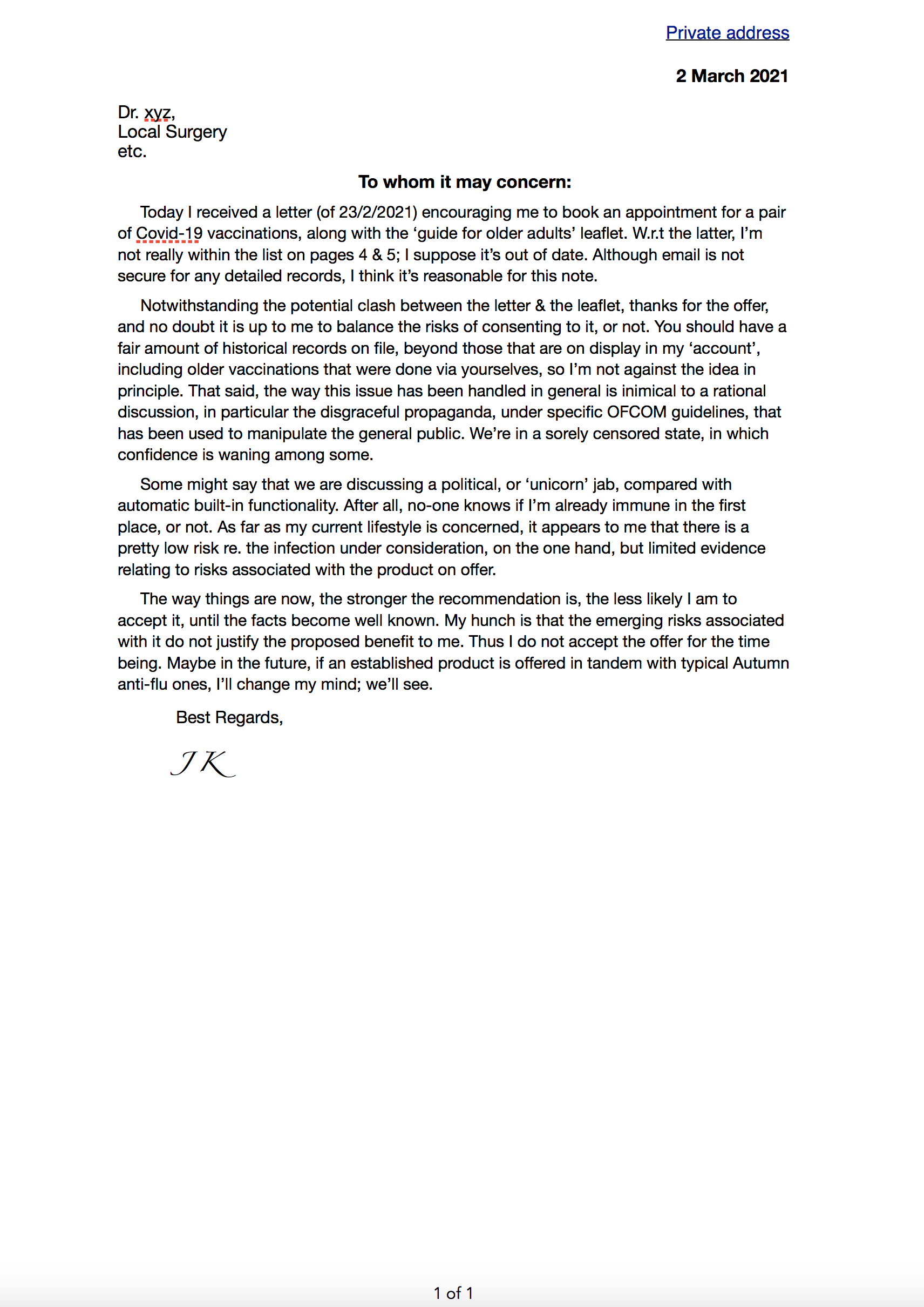 I remember receiving my “invitation” to be experimented on, sometime towards the end of Feb 2021. I binned it, but now wish I hadn’t. It was evidence so I should have kept it. I don’t recall it giving me any “possible adverse effects” information whatsoever. Since I wasn’t in a high-risk group I was about 7 on their priority list which had given me plenty of time to do my own research.