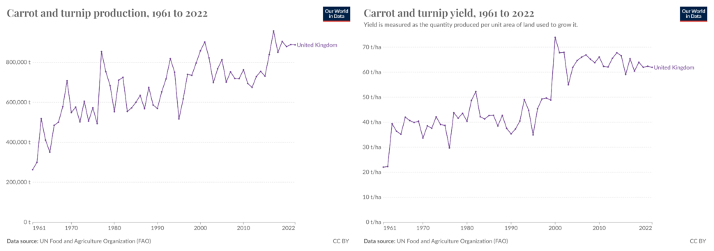 The problem for Hallam is that carrot production in the U.K. shows very little sign of sensitivity to climate change. Since the 1950s, carrot and turnip production has quadrupled. More significantly, yield per hectare – the indicator which is more sensitive to climate and weather – has more than tripled. If Britain was experiencing a climate-related carrot crisis, we would see this indicator plunge, rather than rise. Consequently, and contrary to fears about price rises, supermarkets are selling a kilo of British-grown carrots for 65p. ‘Wonky’ or ‘imperfect’ carrots are being sold at 45p/Kg. The struggle for carrot farmers may therefore be less high water than low prices for their products.