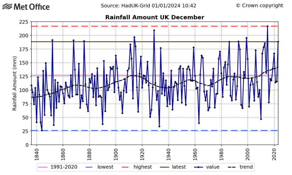 The worst of those months for the U.K. – the ninth wettest December – can be seen in its historical context. The Met Office provides a running average, which would seem to stand as an approximation of ‘climate change’. But despite that moving trendline, there were plenty of comparable Decembers in the mid to late 19th Century, and in the early and late 20th Century.