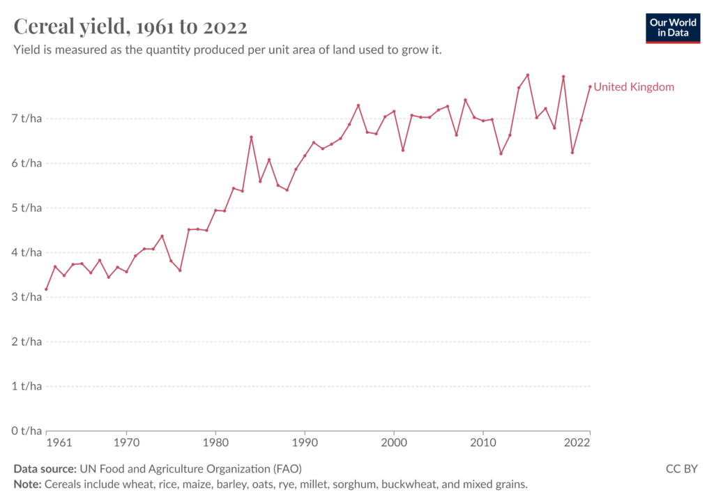 And the same story is revealed in UN data for nearly all British-grown vegetables. Inspection of the data reveals nothing resembling a pattern of climate change for the yield of wheat, oats, and cereals in general, onions, apples and pears, dry peas and other pulses, plums, potatoes and other roots and tubers, rapeseed, raspberries and strawberries, sugar beet and tomatoes. The only reductions in yield relate to the production of cauliflower and broccoli, and green peas. However, given that these data are significant outliers, we can for the moment assume that other reasons, perhaps economic or regulatory, better account for apparent declines in yield. Meanwhile, there is plenty of evidence in the U.K. and beyond that the era of global warming – or climate crisis – has been an era of bumper harvests.